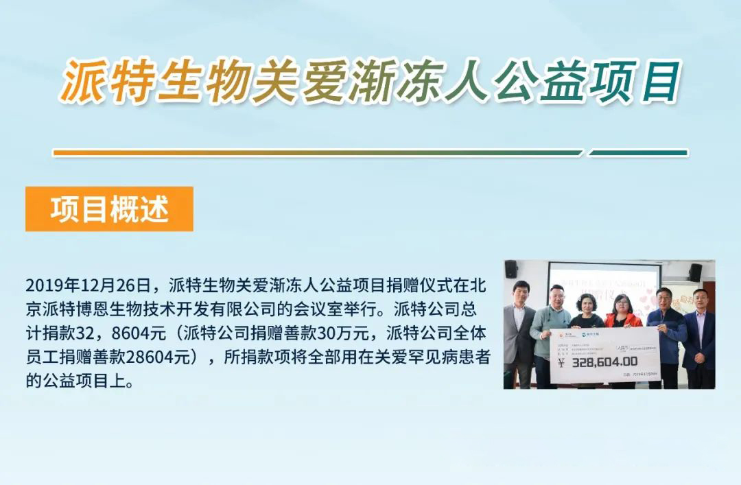 【派特生物關愛漸凍人公益項目一助力漸凍人舒暢呼吸】是由蒲公英漸凍人關愛中心攜手派特生物公司發(fā)起的公益項目,派特生物總資助金額149000元(拾肆萬九仟元整) 。