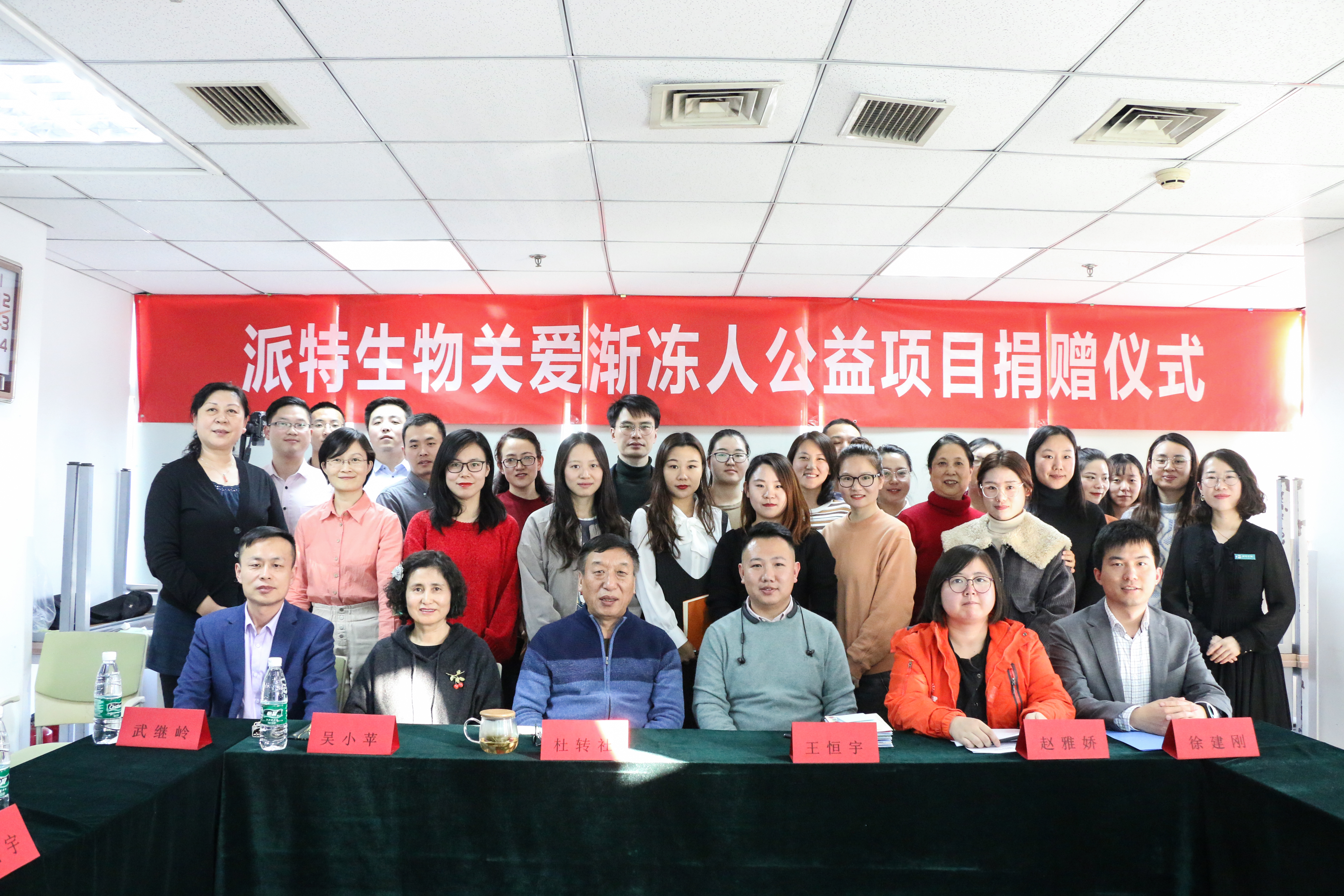2019年12月26日,派特公司關愛漸凍人公益項目捐贈儀式在派特公司總部順利舉行。 蒲公英漸凍人罕見病關愛中心副理事長王恒宇,關愛漸凍人公益項目項目主任趙雅嬌,法務理事徐建剛等作為受捐方代表出席捐贈儀式。派特公司總經理杜轉社,副總經理吳小蘋,副總經理武繼嶺,品牌管理總監(jiān)陳飛宇,辦公室主任、人力資源部經理姚軍,及二十余位派特員工代表出席捐贈儀式。