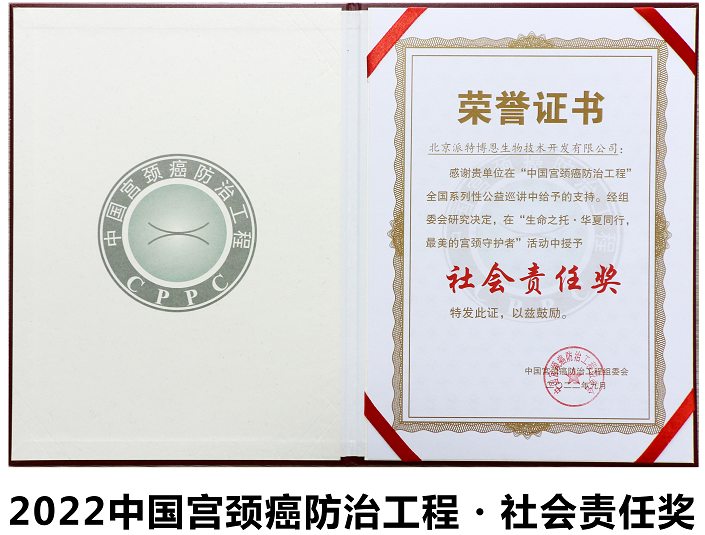 2008年,旨在提高群眾重視,降低宮頸癌的發(fā)生率和死亡率的“中國宮頸癌防治工程“正式啟動,由此開啟了宮頸癌預防的新篇章。經過十余年的推動,中國宮頸癌的防控取得了重大進展。自2018年開始中國宮頸癌防治工程組委會隆重頒發(fā)“生命之托·華夏同行,最美的宮頸守護者”系列獎項,對積極推動我國宮頸癌防治事業(yè)的專家學者和社會企業(yè)進行表彰和肯定。派特生物自此連續(xù)多年榮獲大會組委會頒發(fā)的“社會責任獎”。榮譽越大,責任越重,榮獲“最美的宮頸守護者·社會責任獎”,也激勵“派特生物”成為更具影響力、更具社會責任感的文化符號和品牌。