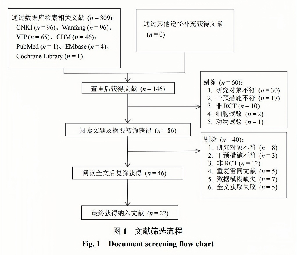 初檢共獲得309篇文獻(xiàn),其中中文文獻(xiàn)303篇,英文文獻(xiàn)6篇;刪除重復(fù)文獻(xiàn)163篇,其中中文文獻(xiàn)162篇,英文文獻(xiàn)1篇;閱讀標(biāo)題及摘要獲得86篇,進(jìn)一步閱讀全文復(fù)篩,最終納入22項(xiàng)RCT[6-27]?文獻(xiàn)篩選流程見圖1?