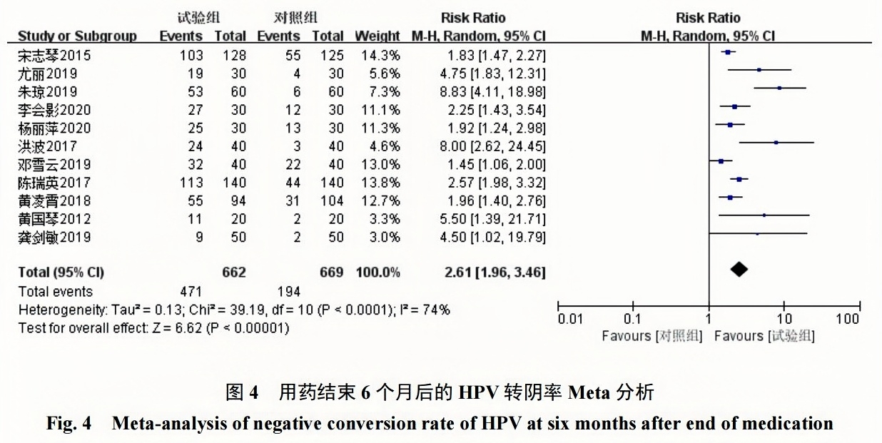2組HPV轉(zhuǎn)陰率對(duì)比具有統(tǒng)計(jì)學(xué)意義 [RR=2.61,95% CI(1.96,3.46),P<0.00001]。見圖 4。