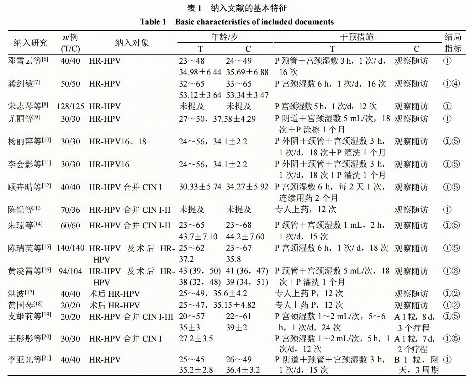 所納入的22項(xiàng)RCT派特靈用法均為經(jīng)凈第3?4天取藥液1~5mL宮頸濕敷,時(shí)間為3~6h,每1~2天用藥1次,用藥3~4d停藥3~4d,共治療12~24次?