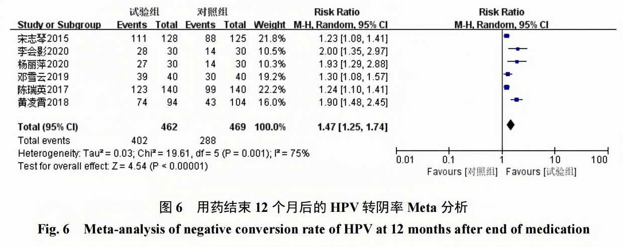 2組HPV轉(zhuǎn)陰率對(duì)比具有統(tǒng)計(jì)學(xué)意義[RR=1.47,95%CI(1.25,1.74),P<0.00001]?見圖6?