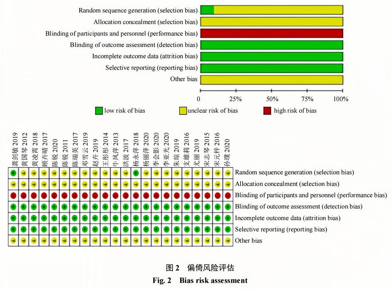 因納入的22項(xiàng)研究均無足夠信息明確是否存在高低偏倚,故均判定為未知風(fēng)險(xiǎn)。具體偏倚風(fēng)險(xiǎn)評(píng)估見圖2。