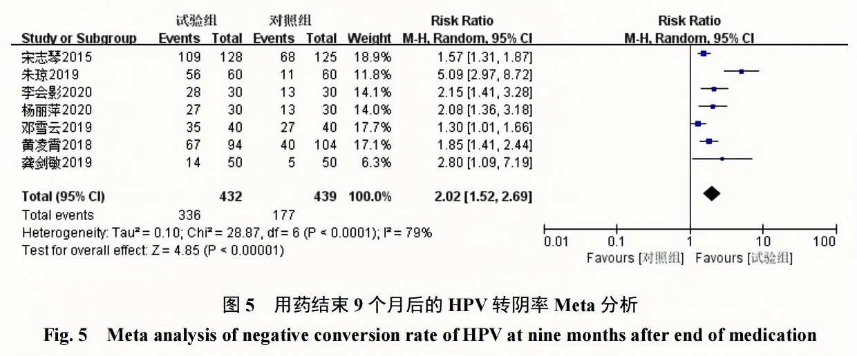 2組HPV轉(zhuǎn)陰率對(duì)比具有統(tǒng)計(jì)學(xué)意義[RR=2.02, 95%CI(1.52,2.69),P<0.00001]。見圖5。