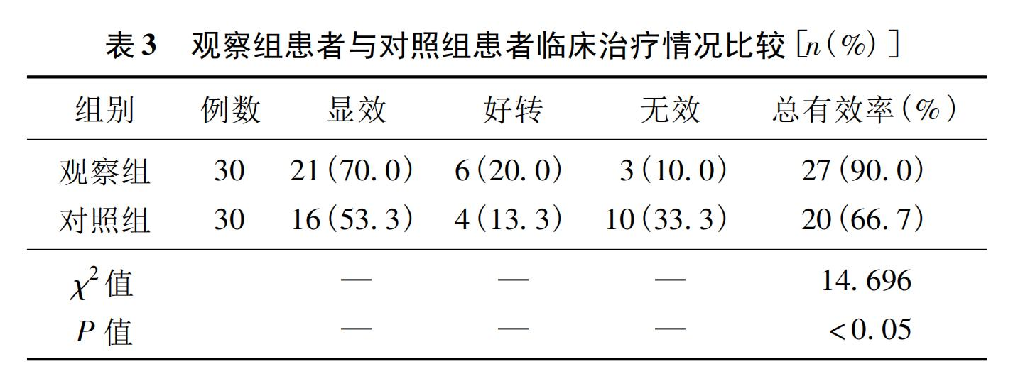 觀察組治療后有27例患者顯示有效,占90.0%,顯著高于對照組的66.7%,差異具有統(tǒng)計學(xué)意義(P<0.05)。