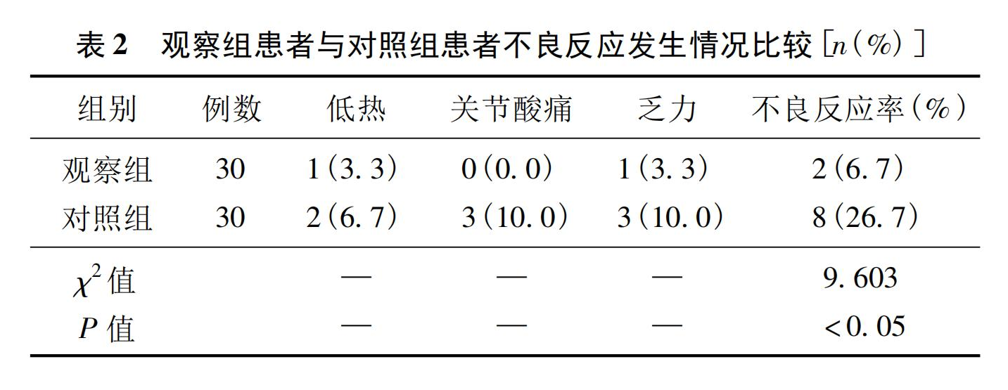 對患者不良反應(yīng)予以隨訪觀察,發(fā)現(xiàn)觀察組患者不良反應(yīng)率為6.7%,較對照組患者的26.7%低,差異具有統(tǒng)計學(xué)意義(P<0.05)。