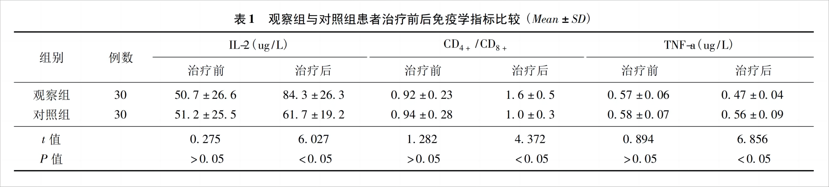 觀察組患者治療后白細胞介素2(IL-2)、腫瘤壞死因子(TNF-a)以及CD4+/CD8+免疫學(xué)指標均得到顯著改善,與對照組比較差異具有統(tǒng)計學(xué)意義(P<0.05);