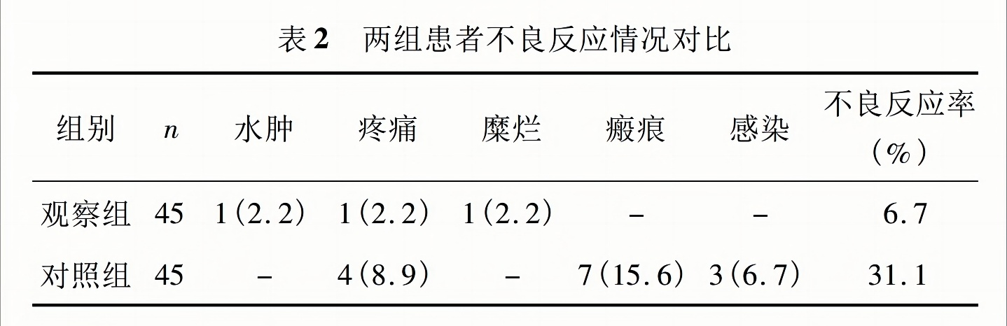 觀察組患者出現(xiàn)1例水腫?1例疼痛?1例糜爛,不良反應(yīng)率為6.7%;對照組患者不良反應(yīng)多表現(xiàn)為局部疼痛?瘢痕等,部分患者出現(xiàn)感染情況,其中局部疼痛4例,瘢痕7例,感染3例,不良反應(yīng)率為31.1%,兩組患者不良反應(yīng)情況對比差異顯著(P<0.05)?
