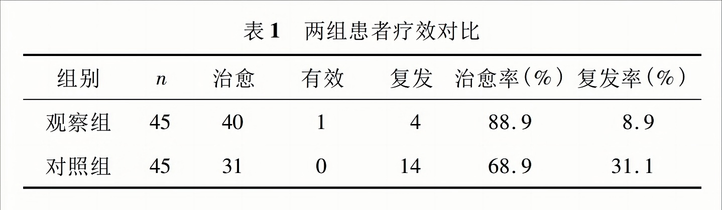 對照組患者4例治療1個月后復(fù)發(fā),5例治療2個月后復(fù)發(fā),4例治療3個月后復(fù)發(fā),治愈率為68.9%,復(fù)發(fā)率為31.1%,兩者差異顯著(P<0.05),見表1?