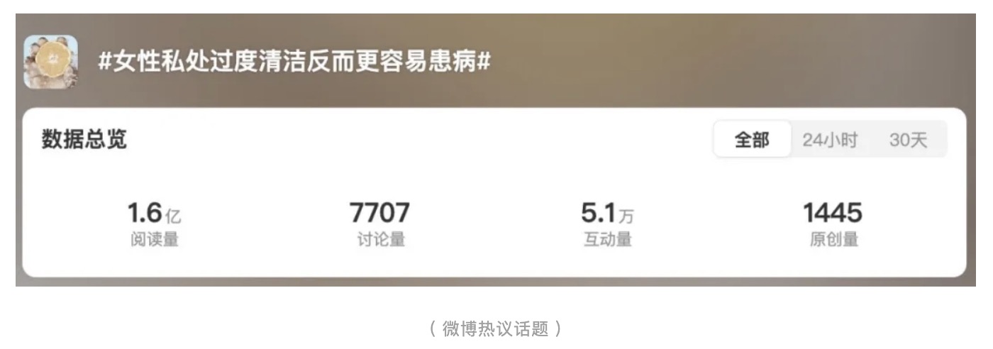 最近,微博上的一條熱搜引起了大家的關注——“女性私處過度清潔反而更容易患?。?/strong>”。截止截稿,該話題已被1.6億人瀏覽、討論。
