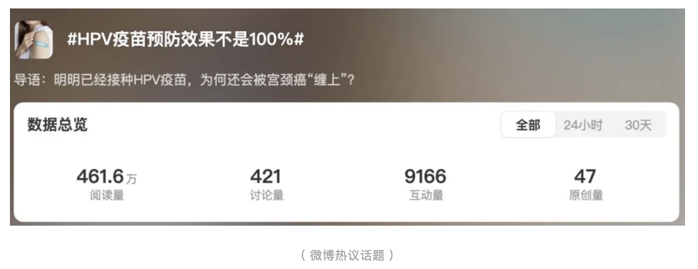 最近,微博上的一條熱搜引起了大家的關(guān)注——“HPV疫苗預防效果不是100%?”。截止截稿,該話題已被400萬人瀏覽、討論。